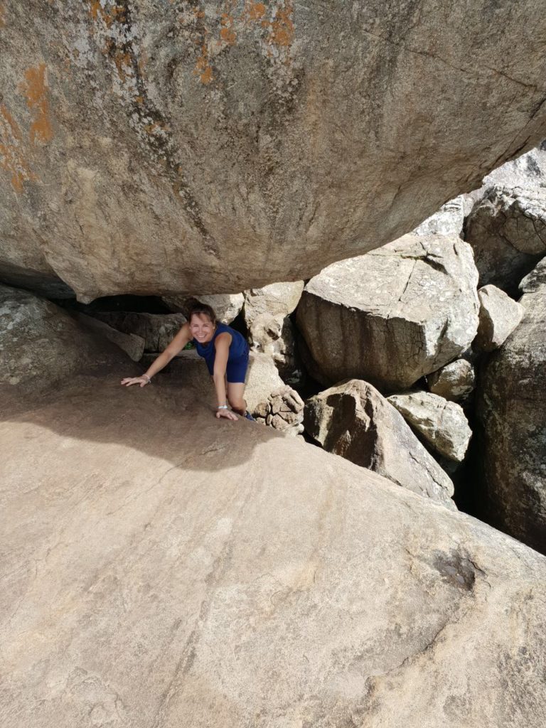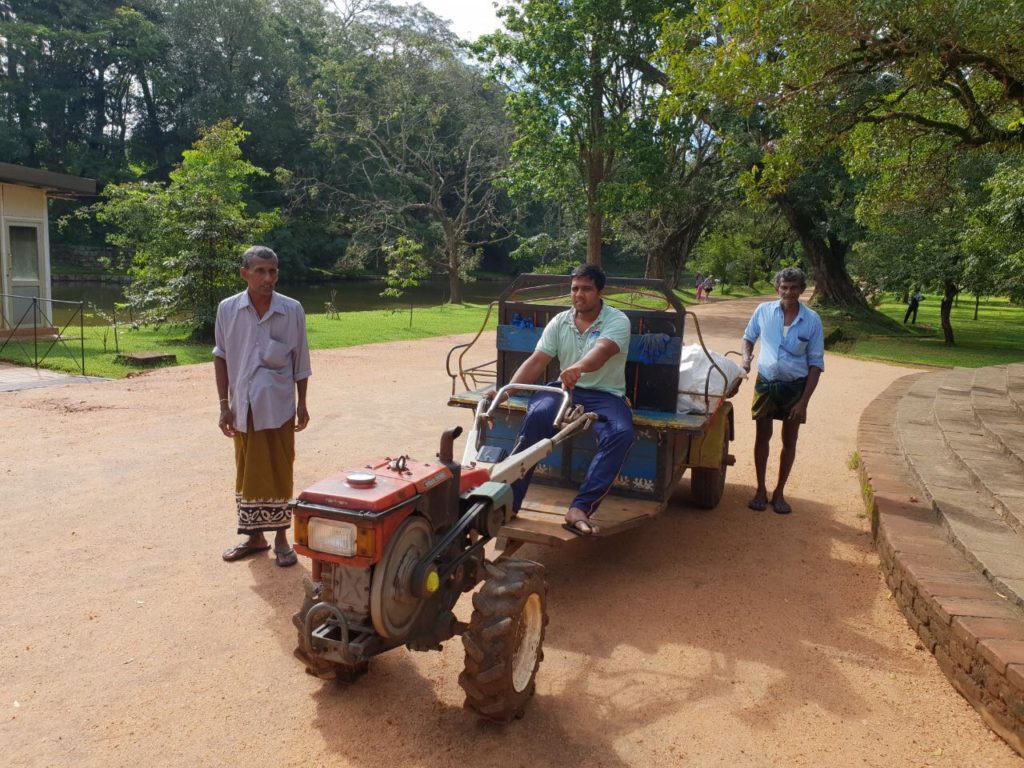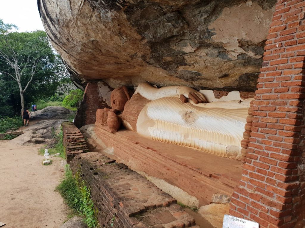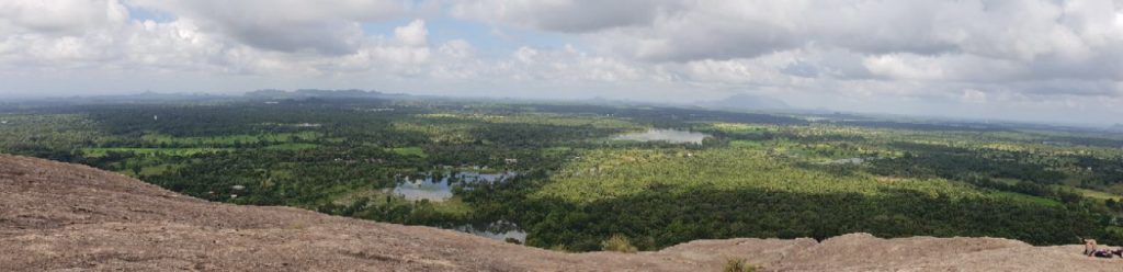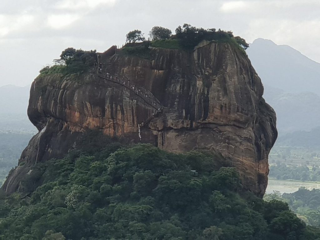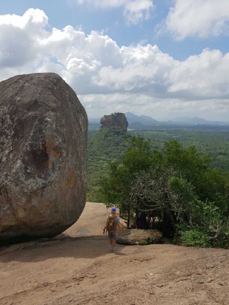 Um 09:00 ging’s los. Zuerst mit dem Bus um 148 Rupies (€0,74 für 4 Personen), dann mit dem Bus um Rupies 92 (€0,46 für 4 Personen), dann mit einer Müllabfuhr (umsonst) und dann zu Fuß. Um 10:00 waren wir beim Pidurangala dem Felsen neben der eher bekannten Felsenfestung (Eintritt: $30 pP und total überlaufen). Aufgrund der exquisiten Aussicht auf die Felsenfestung erweist sich der Pidurangala als idealer Abschluss des Kulturprogramms und wird zuweilen sogar als „besseres Sigiriya“ bezeichnet. Der Aufstieg ist allerdings ebenso schweißtreibend und alles andere als einfach. Insbesondere im letzten Abschnitt Grüßen an einigen wenigen Stellen sogar die Hände zu Hilfe genommen werden, ehe ein herrlicher Rundblick reichlich für die Mühen entschädigt. Der Zugang erfolgt von Nordwesten über ein Kloster, in dem das Eintrittsticket gelöst wird €2,50; anschließend führt ein schattiger Treppenweg aufwärts uns berührt dabei Relikte eines Waldklosters aus vorchristlicher Zeit. Das Wahrzeichen am Gipfelplateau ist ein tonnenschwerer Gneisrundling – ein beliebtes Fotomotiv vor dem Hintergrund der Felsenfestung.